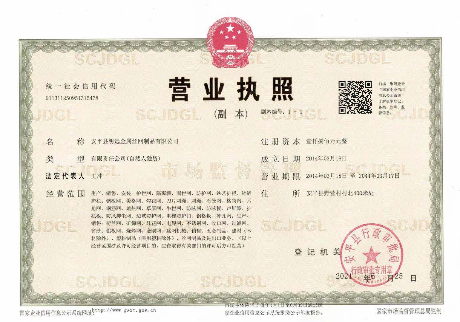 安平縣明遠(yuǎn)金屬絲網(wǎng)制品有限公司 - 座落于絲網(wǎng)產(chǎn)業(yè)基地河北安平,二十年絲網(wǎng)制作經(jīng)驗,是一家從拔絲、焊接、打砂、折彎、鍍鋅、噴塑、浸塑、為成品,生產(chǎn)研發(fā)安裝為一體的交通工程護欄網(wǎng)、光伏景區(qū)圍欄網(wǎng)專業(yè)型企業(yè)。明遠(yuǎn)公司擁有先進的生產(chǎn)設(shè)備,全自動浸塑、噴塑、鍍鋅生產(chǎn)線,電腦焊網(wǎng)機組,聯(lián)合壓力機,數(shù)控折彎機,槍尖沖孔機等多臺輔助設(shè)備,具有大批量生產(chǎn)能力。